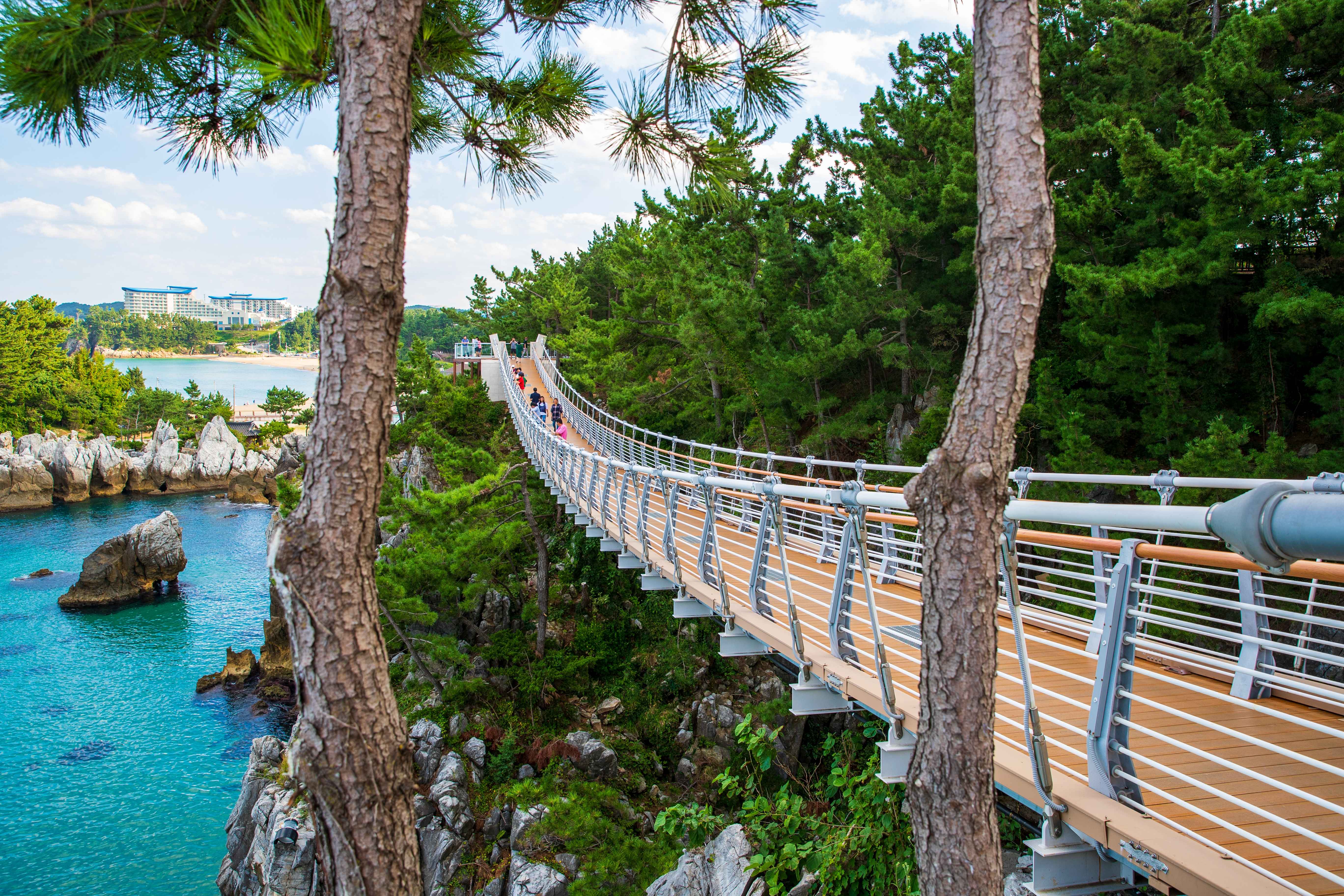 촛대바위와 기암괴석이 어우러진 절경 위를 걷는 출렁다리로, 동해의 웅장한 자연을 가까이에서 느낄 수 있는 명소입니다. 바다 위를 걷는 듯한 짜릿함과 함께 탁 트인 풍경을 감상할 수 있으며, 특히 일출 시간에는 더욱 인상적인 장면을 만날 수 있습니다.ⓒ한국관광공사 포토코리아-김지호