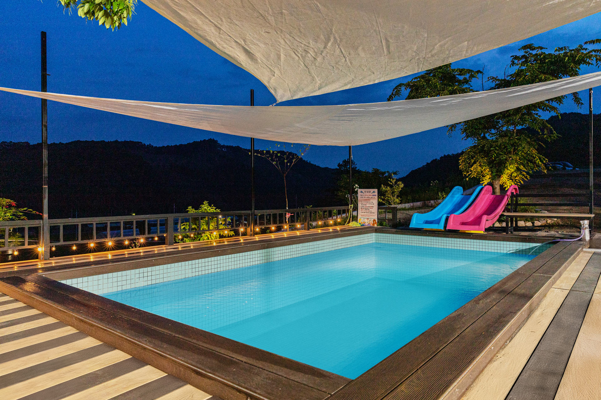 - 개별 수영장 (사계절 운영) : 제네하우스 독채 객실 / 80,000원 (미온수) / 15:00~익일 11:00 / 모자 착용 / 온수풀을 이용하시고자 하는 고객님께서는 반드시 사용일 4일전에 신청해 주셔야 하며, 시간이 촉박 할 경우 관리자에게 유선 문의 / 현장결제 - 야외 수영장 (하절기 운영) : 무료 / 10:00~17:00 / 모자 착용