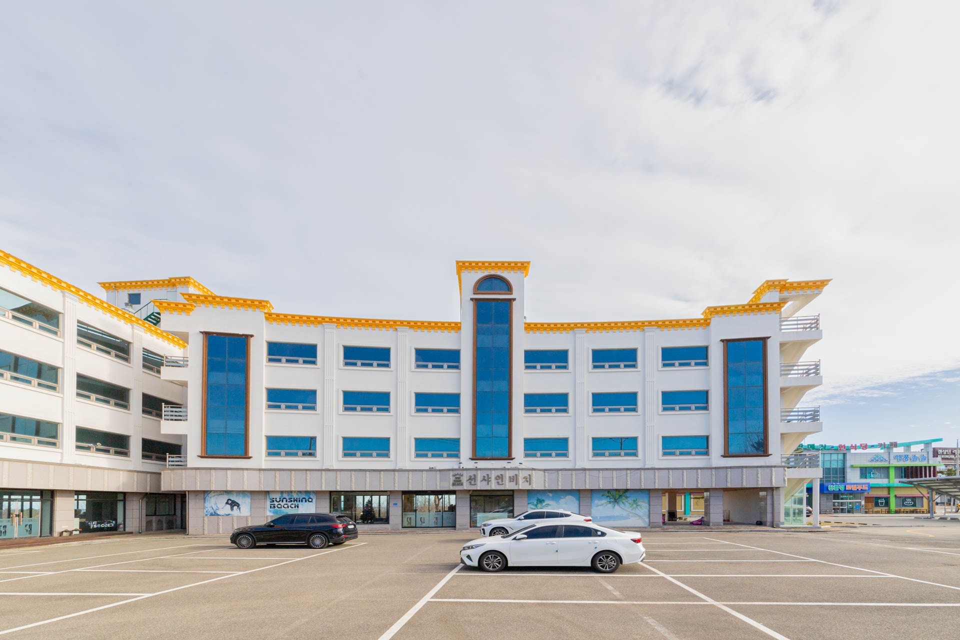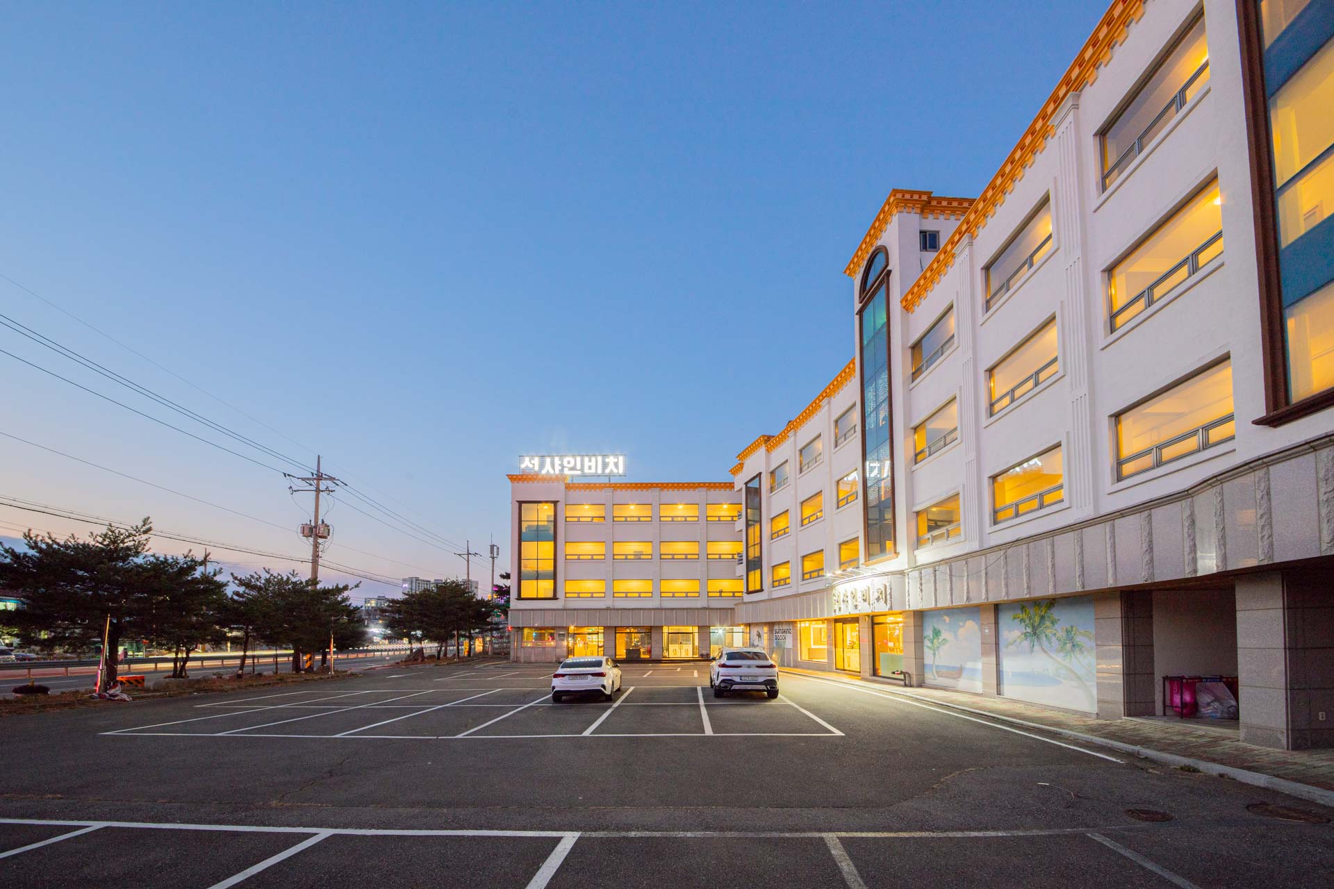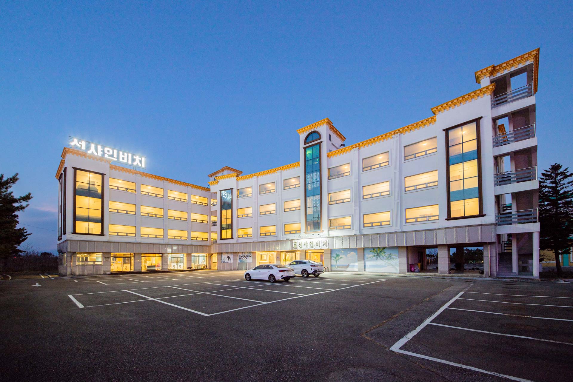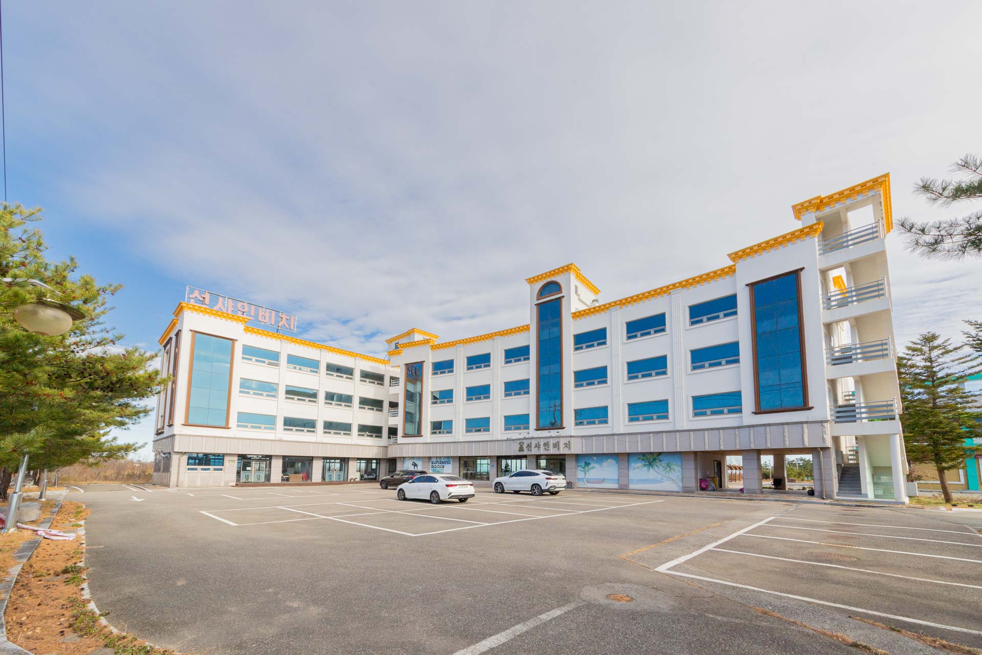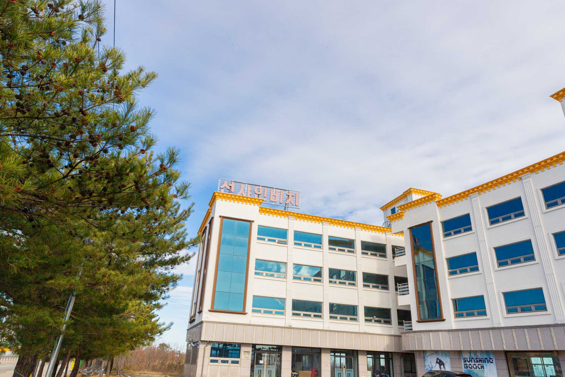 소나무 밭과 푸른 바다가 어우러진 고성 선샤인비치.